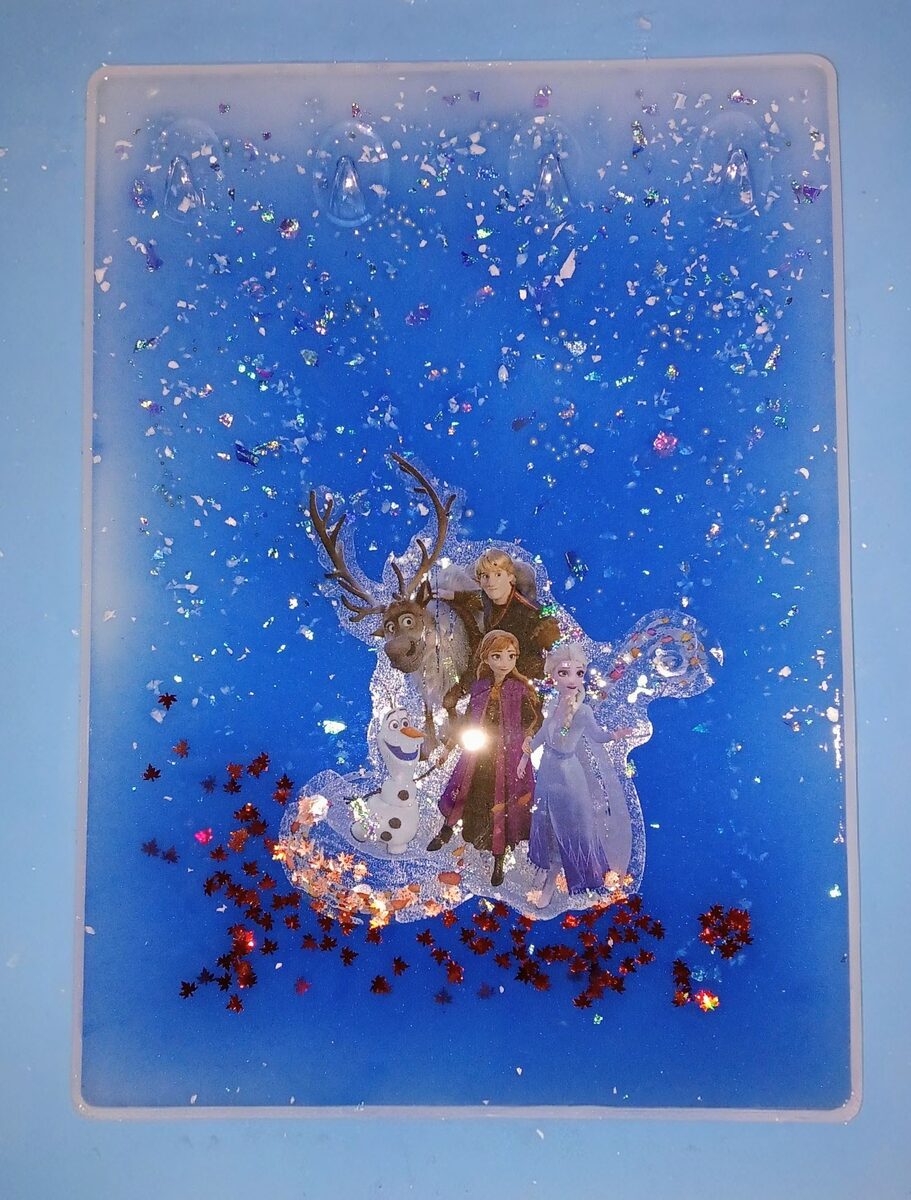 Standing tall in the soft snow, the resin plaque features a stunning blue-to-clear gradient that mimics a frozen lake, infused with shimmering silver iridescent flakes that catch the golden hour light.