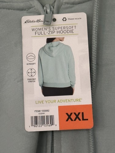 The product is a brand new Eddie Bauer Women's Supersoft Full-Zip Hoodie in size XXL Ocean Acqua. This hoodie is designed for women, featuring long sleeves, a hood, and a full zipper closure. The hoodie is made by Eddie Bauer, known for their high-quality clothing, and comes in a stylish blue color. It is perfect for activewear, offering both comfort and functionality for the wearer.