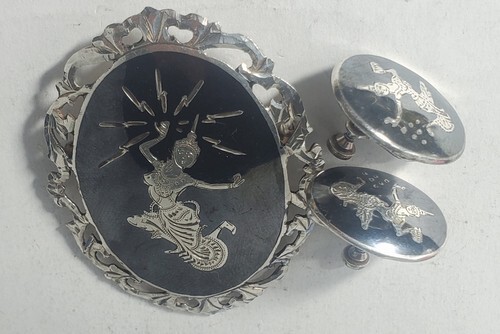 Gorgeous Sterling Silver Siam Niello Enamel Brooch Set of 5 (49.1g) Features Etched Figure Dancer with Black Enamel Background All shipments include insurance and delivery confirmation or signature confirmation. Local Pick-up is available in our showroom. All international packages will have the required customs declaration and value of order. Your continuing satisfaction is very important to us. We offer a 30 day money back return policy. If you are unhappy with your purchase for any reason, please notify us so that we can begin the returns process. All items for sale are available for viewing at our Southern California showroom. We would like to thank all of our loyal customers for their continued support. If you have any questions, comments or concerns, please click "Ask a question"