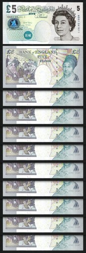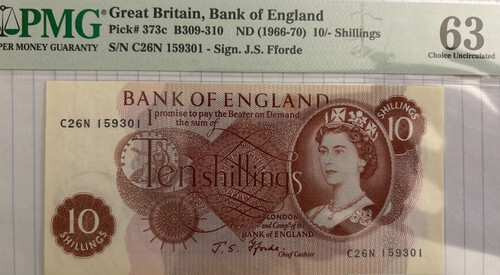 Consecutive numbered notes: 2nd series, 5 shillings (1961) Uncirculated, 5 notes cancelled PSM#20d. 3rd series, 10 shillings (1956) Uncirculated, 2 notes cancelled PSM#28b. 4th series, 10 shillings (1962) Uncirculated, 3 notes cancelled PSM#35b.