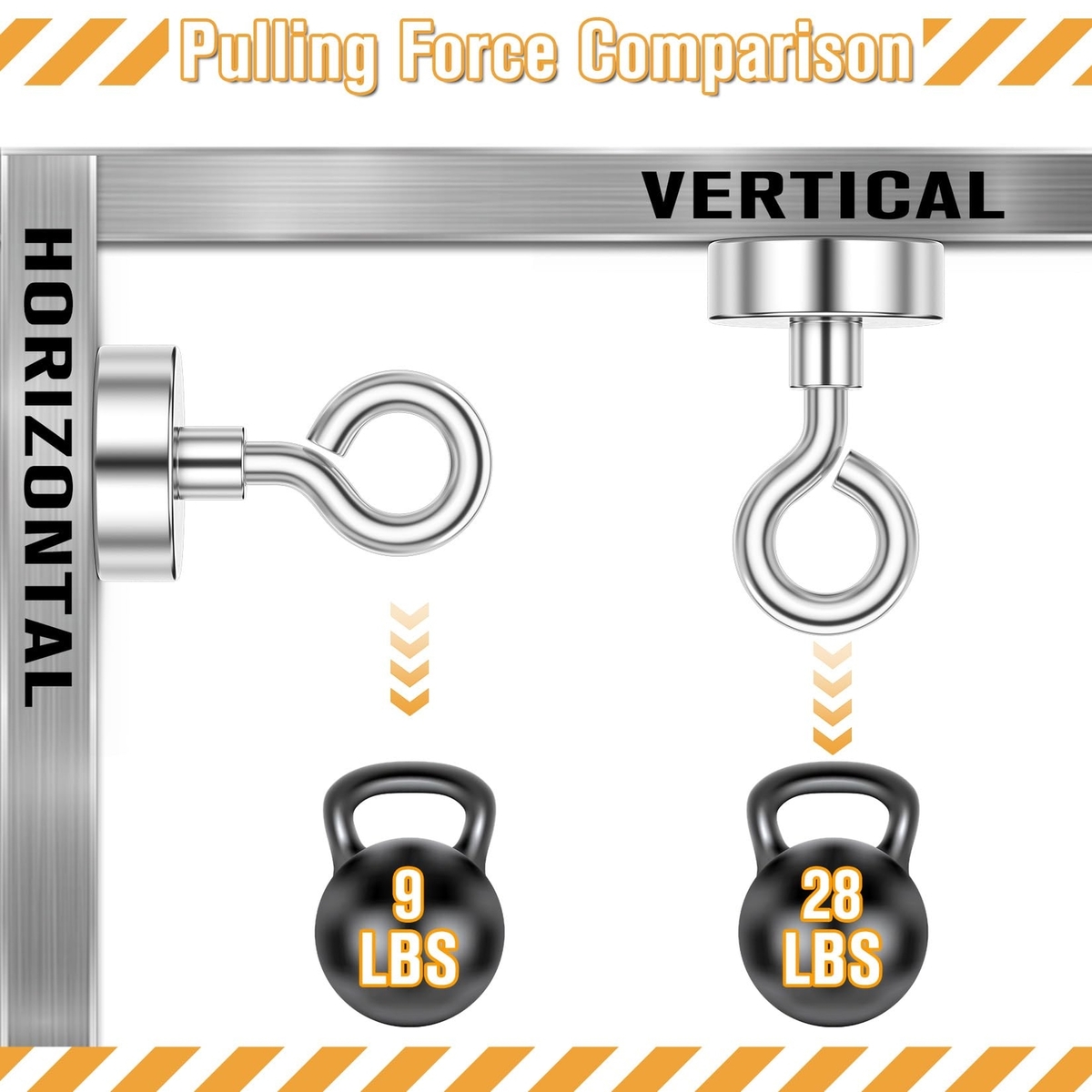 ?BEARABLE TRACTION?28LBS tension of super strong magnetic hook is based on the direction of tension perpendicular to the contact surface and comes in pack of 6. Please note that the tension of the magnets hooks is also affected by the direction, the material of the contact surface and other factors.