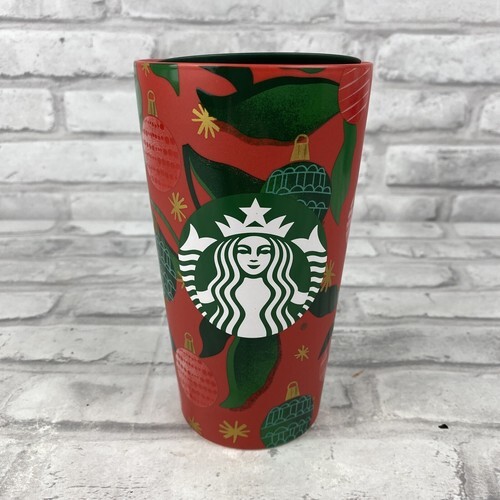 Starbucks 2019 Ceramic Tumbler 12oz Travel Coffee Mug Lid Red Green Ornaments