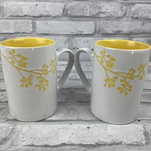 Pier 1 Sunny Branch Mug Set of 2 Wild Olive White Stoneware Yellow Leaves