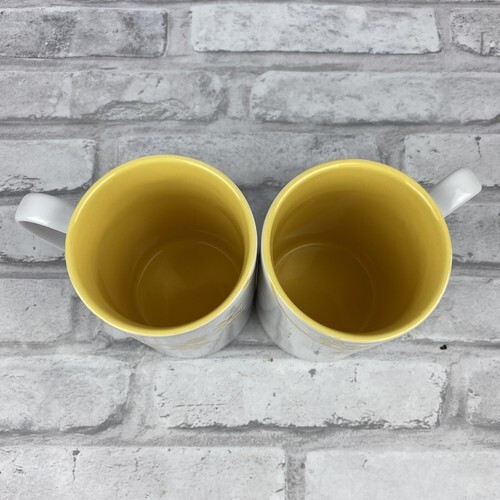 Great pre-owned condition. The bottom of the mugs show that the labeling is wearing off. One mug has a small chip on the bottom edge.