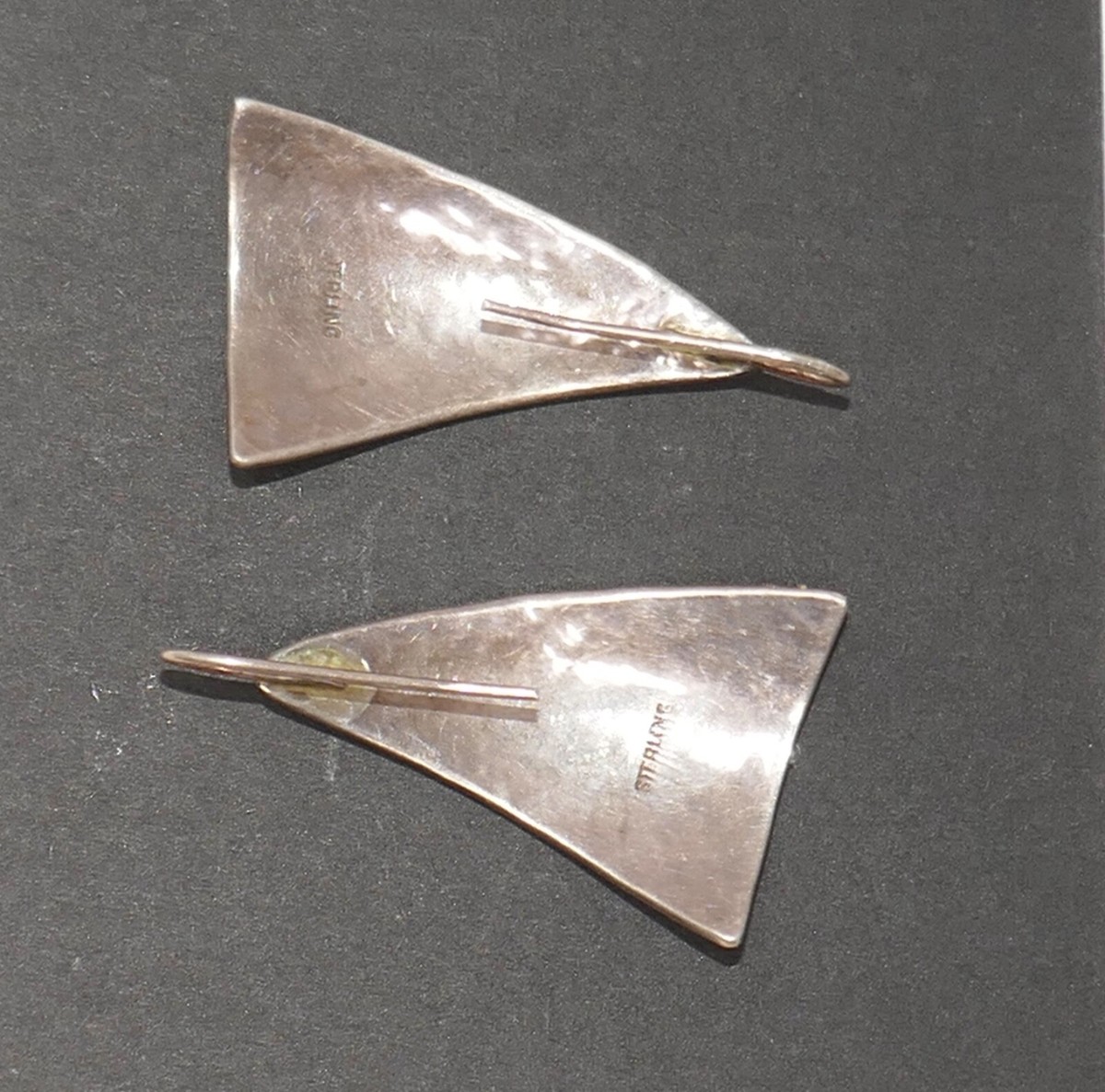Add a touch of sophistication to your outfit with these stunning Sterling Silver Textured Triangle Dangle Earrings. The unique triangle shape and textured design of these earrings make them a true statement piece. Measuring approx. 1.25" long and weigh 5.9 grams. The hook closure ensures they are comfortable to wear all day long.