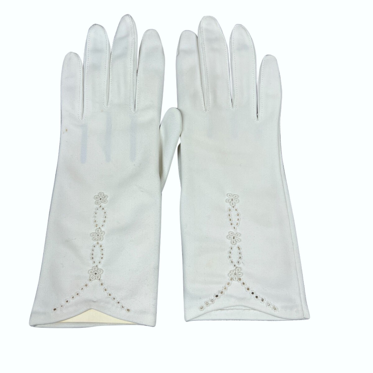 Step back into an era of grace with these exquisite Vintage 1950s Dainty White Gloves! Imagine them gracing your hands at a tea party or a Sunday church service. These gloves are a pristine clean white and feature a truly pretty eyelet and flower design on the top. They even still have their original paper "hands" inside, a sweet little detail that speaks to their untouched past!