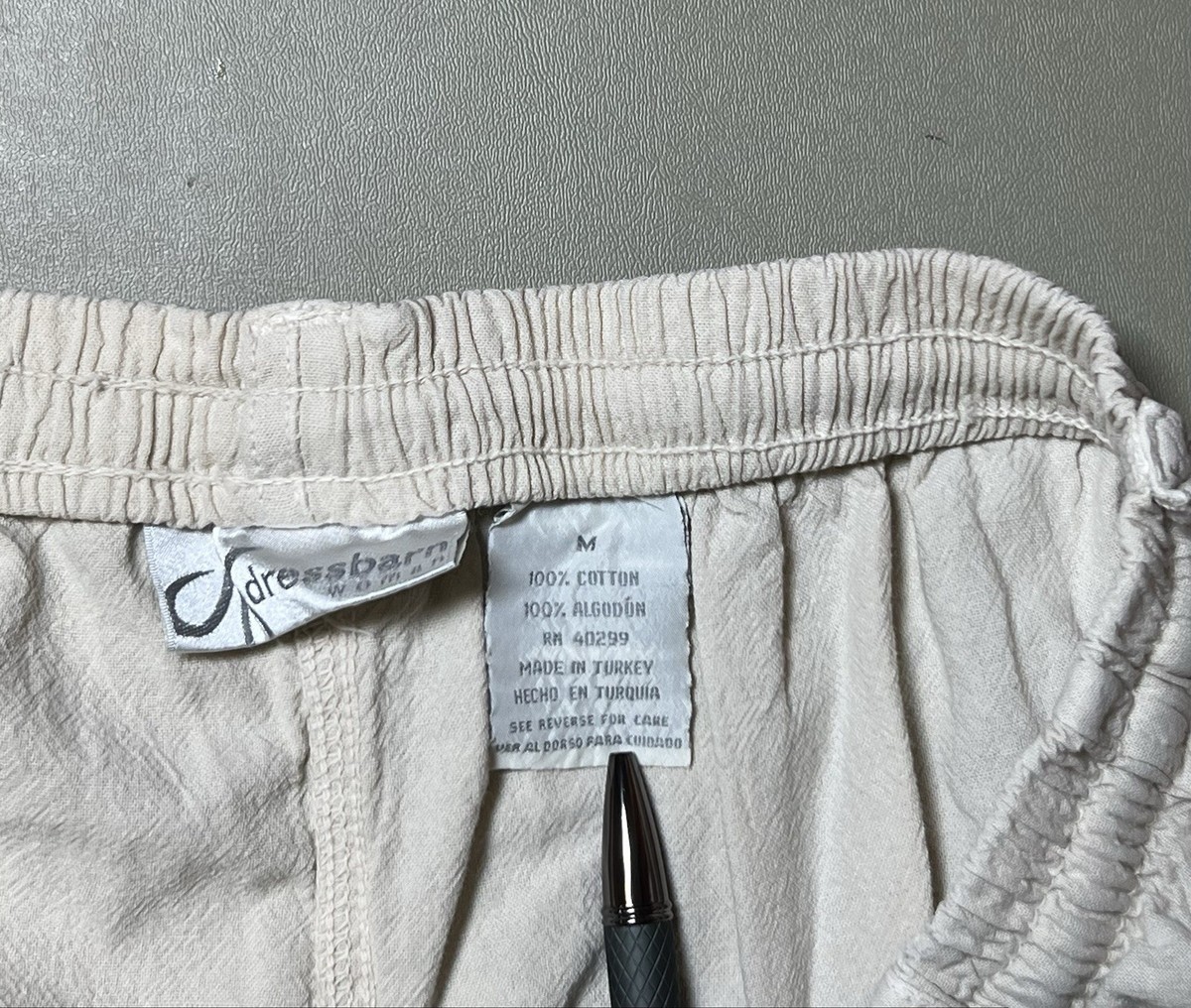 The Dressbarn Woman Pants in size M and ivory color are designed with an elastic waist for comfort fit. These pants feature one cargo pocket, adding a stylish and functional element to the classic ivory color. Perfect for everyday wear, these pants are tailored for a regular fit and are a versatile addition to any woman's wardrobe.