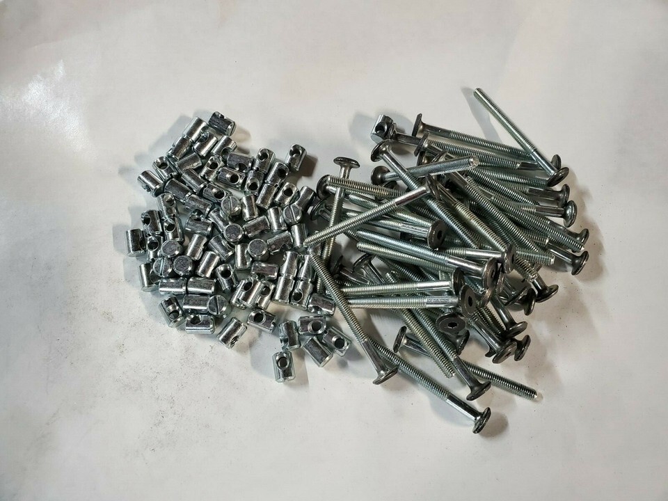 50 pcs. of M6x70mm Furniture bolt's with barrel nuts the barrel nuts are 10 mm in diameter the bolts are silver in color with the heads painted black some have scratches in the black paint from being packed in bulk boxes.