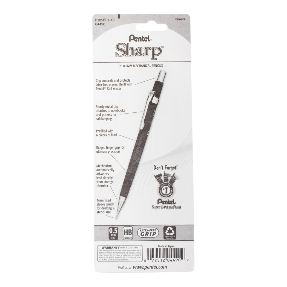 Pentel Sharp Mechanical Pencils with Built-In Erasers 0.5mm Lead No. 2 Black 2Pk