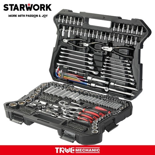 Includes combination wrenches, long-nose pliers, adjustable wrench, rip claw hammer, quick-release ratchet, drive sockets, tape measure, and more.