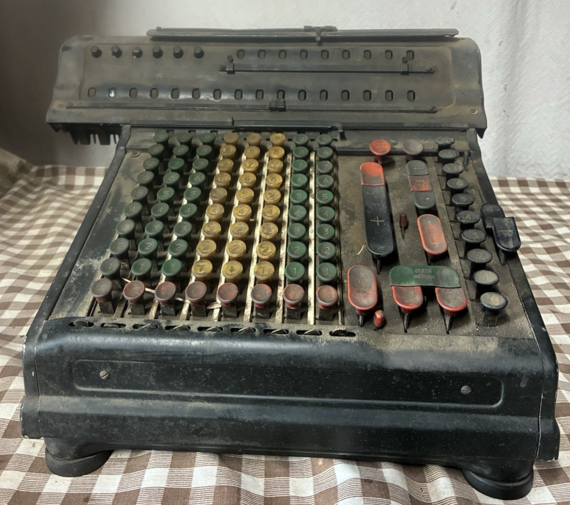 The Vintage Marchant ACR8M Calculating Machine is an electric adding machine with 8 columns, manufactured in the United States circa 1946 by the Marchant Calculating Machine Company. This antique piece of equipment is a valuable collectible for those interested in cash registers, adding machines, and historical technology from the mid-20th century. Its sturdy construction and functionality reflect the quality craftsmanship of that era, making it a unique and sought-after item for collectors and enthusiasts alike.