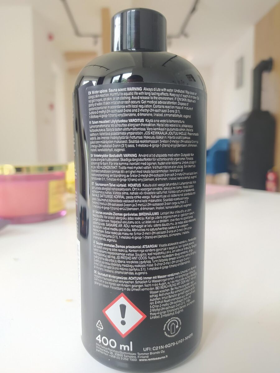 Add some Rento sauna scent to a sauna bucket and throw water on a hot sauna stove for aromatic steam.