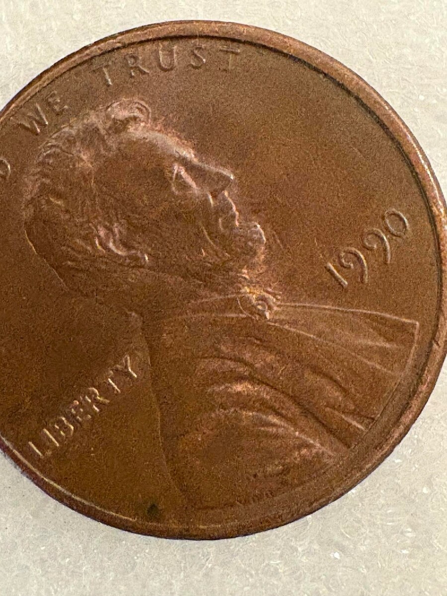 The product is a 1990 Lincoln Memorial Penny with multiple errors. This copper coin was struck in a Business setting at the Philadelphia Mint. It features varieties such as Wide AM, DDR, inflated "G", and Rail-RIM errors. The coin is circulated and uncertified, making it a unique addition to any US coin collection.