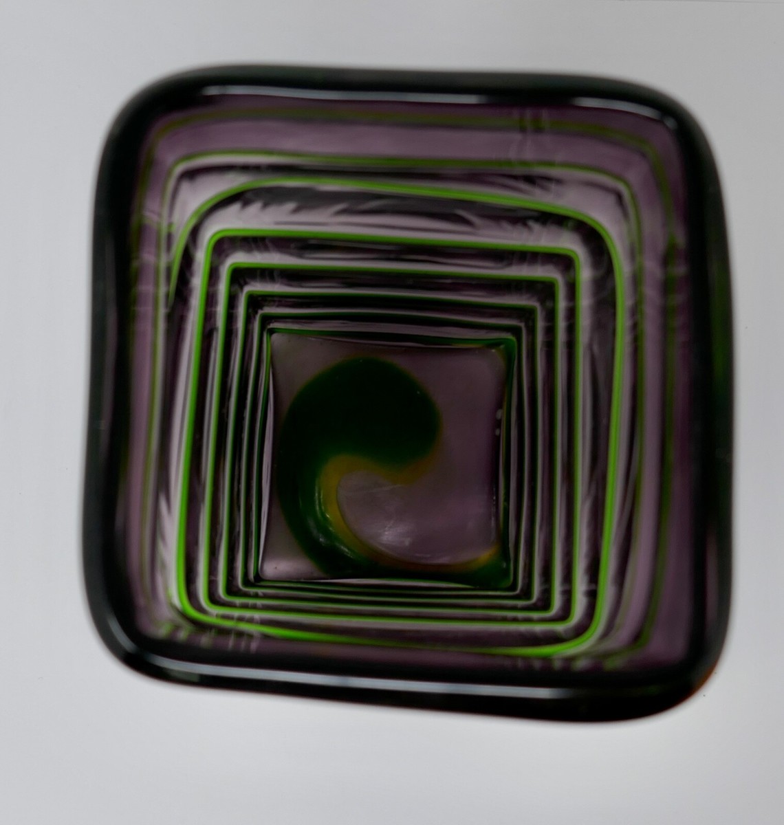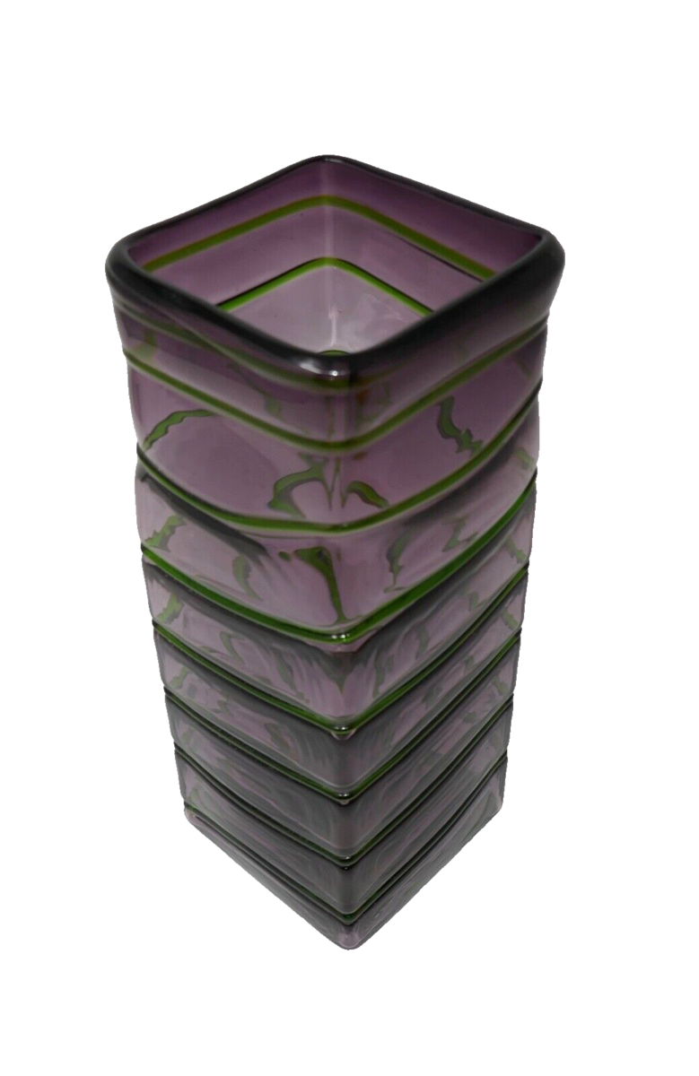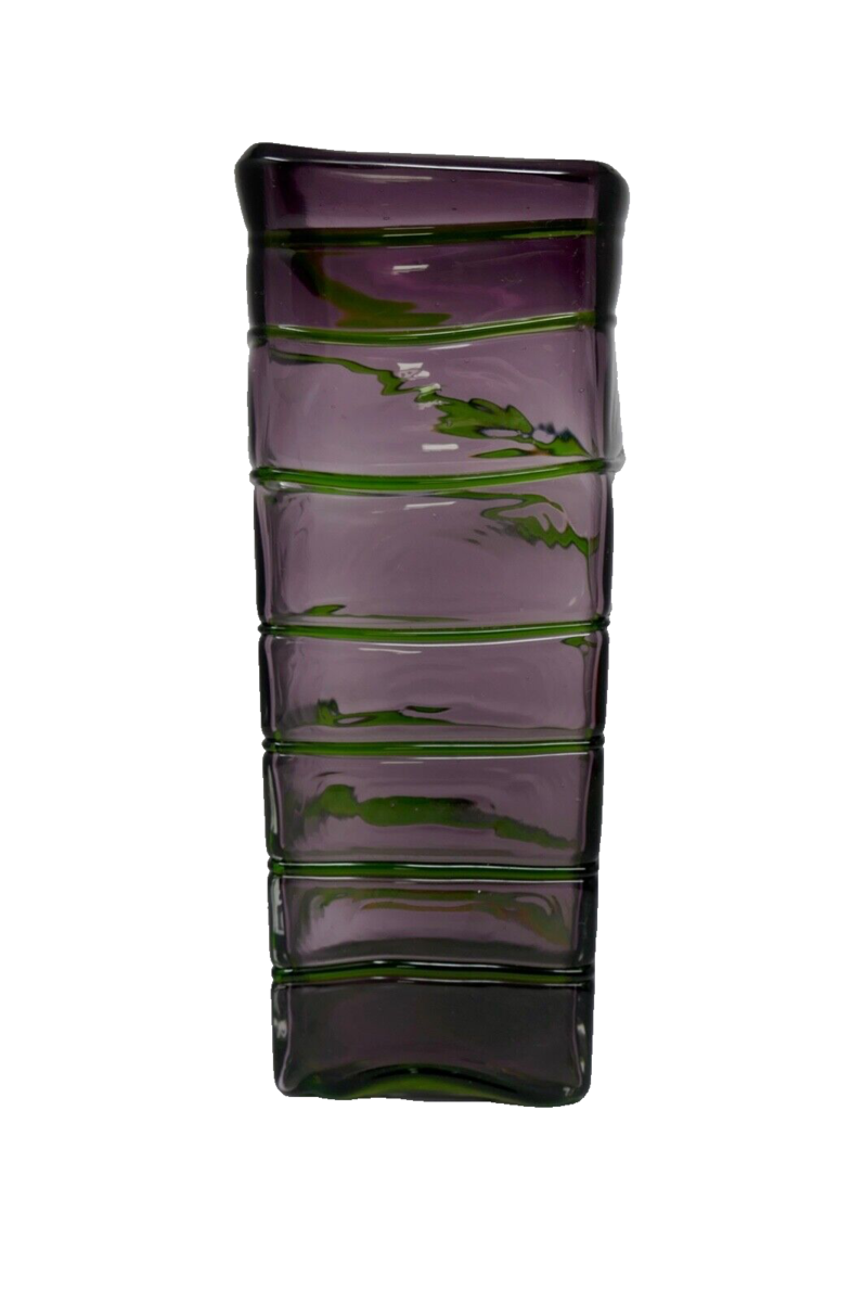 Murano Style Amethyst Purple w/Emerald Green Wrap Around Square Vase