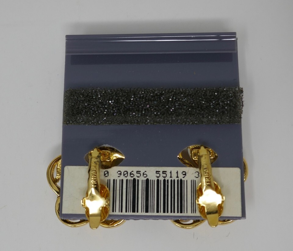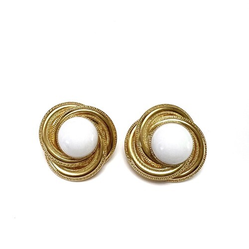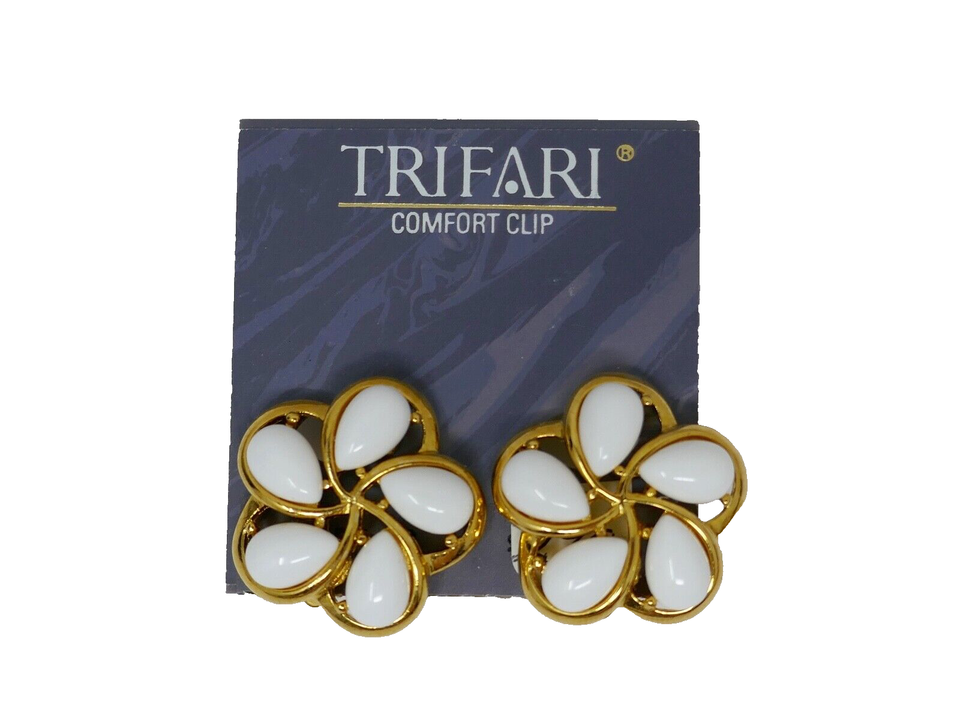 Up for sale is a pair of Trifari Goldtone White Cabochon Comfort Clip On Earrings.