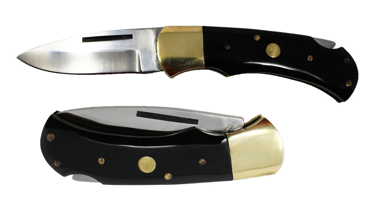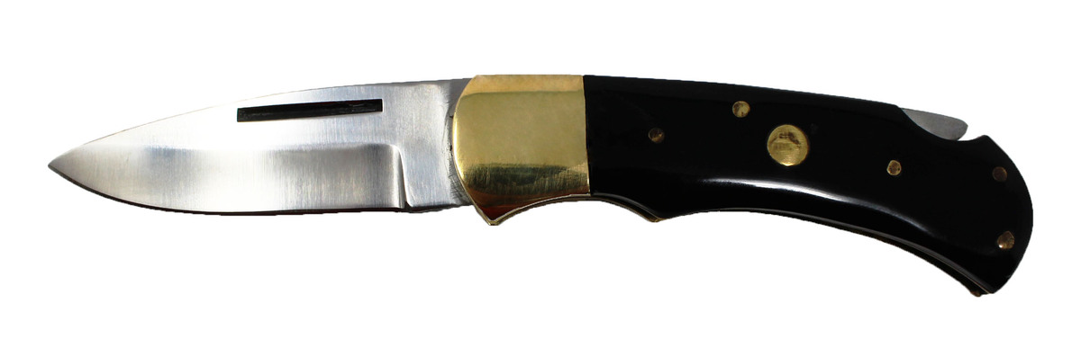 Brand new pocket knife made from rust-free stainless steel. Features a wooden and brass curved handle for durability. Measures 4" long by 1 3/8" when closed. Blade Measures 3" long by 7/8" wide.