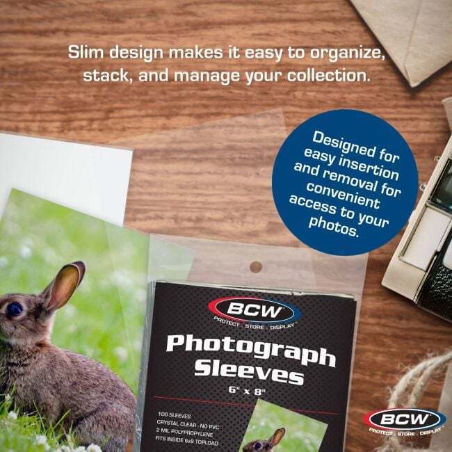 The BCW 6x8 Photo Sleeves are an acid free, archival quality product made of crystal clear polypropylene. Use with the BCW 6x8 Photo Topload Holder.