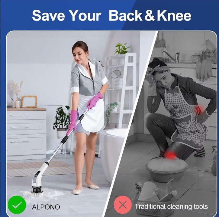 Enhance your bathroom cleaning routine with the Alpono 7 Heads Electric Spin Scrubber, a versatile and efficient tool designed to tackle grime and dirt in your bathtub and bathroom surfaces. Its expandable, folding design paired with a telescopic handle allows for easy storage and maneuverability, ensuring you can reach every nook and cranny with ease.