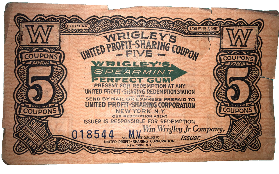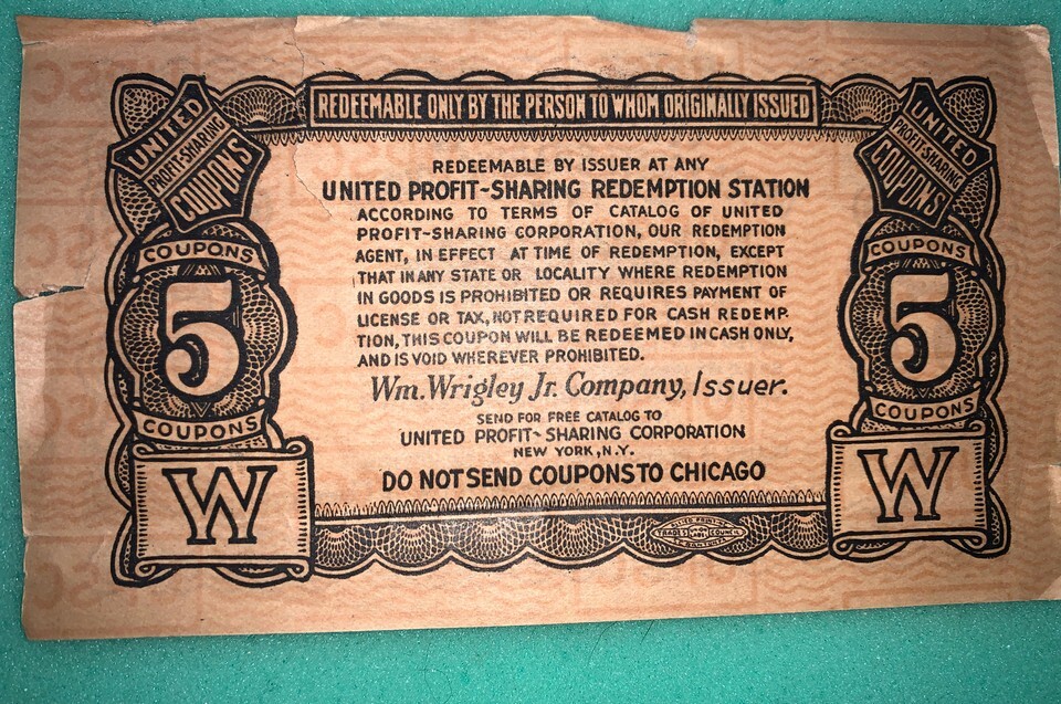 1930s Wrigley's Spearmint Gum United Profit Sharing 5-Coupon Certificates