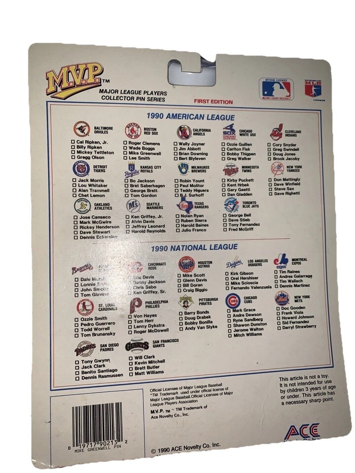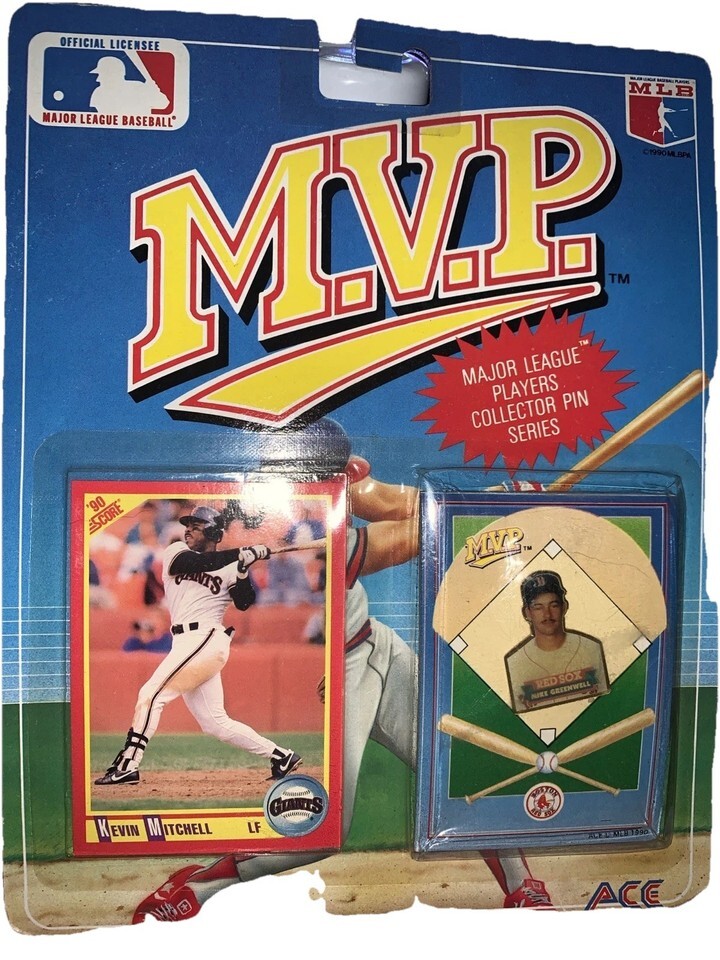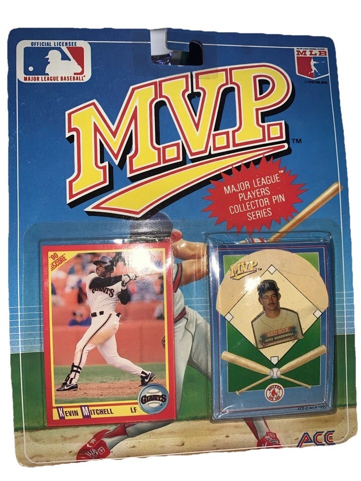 The product is a 1990 MLB Kevin Mitchell collectors set featuring a card and pin back. This vintage set includes items related to Mike Greenwell, a player from the Boston Red Sox. The set is sealed and offers collectors the opportunity to own unique sports memorabilia from the MLB.