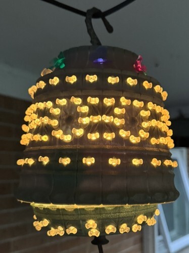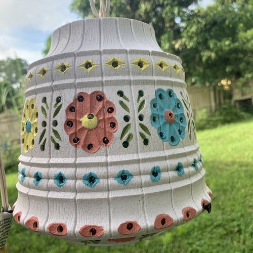 Add a vintage touch to your lawn or patio with this 1970s Lawnware Hanging Swag Patio RV Camper Flower Pot Light. The large, corded electric lamp features a colorful multicolor flower pattern and a drum-shaped design with a swag lamp. Measuring 7 inches in diameter and 5.5 inches in height, this water-resistant lamp is made of durable plastic and has a matte finish. Ideal for collectors, this original piece from Lawnware USA is a must-have for any vintage-inspired home decor. With a plug-in control style and white cord color, this lamp is perfect for adding a cozy touch to your outdoor space. Hang it up easily with its portable and hanging features.