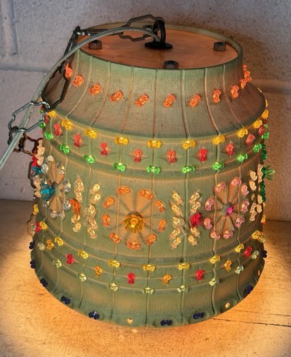 The Lot of 5 Lawnware Brown Hanging Lamp Camping RV Swag Light Flower is a vintage swag lamp from the 1970s, featuring a lantern design with a beaded novelty style. The lamp has a matte finish and multicolor light, with incandescent lighting technology. Made of plastic and with a corded electric power source, this original piece from Lawnware adds a retro charm to any space. The swag lamp has a flower pattern and a white cord, making it a unique and nostalgic addition to any collection or decor.
