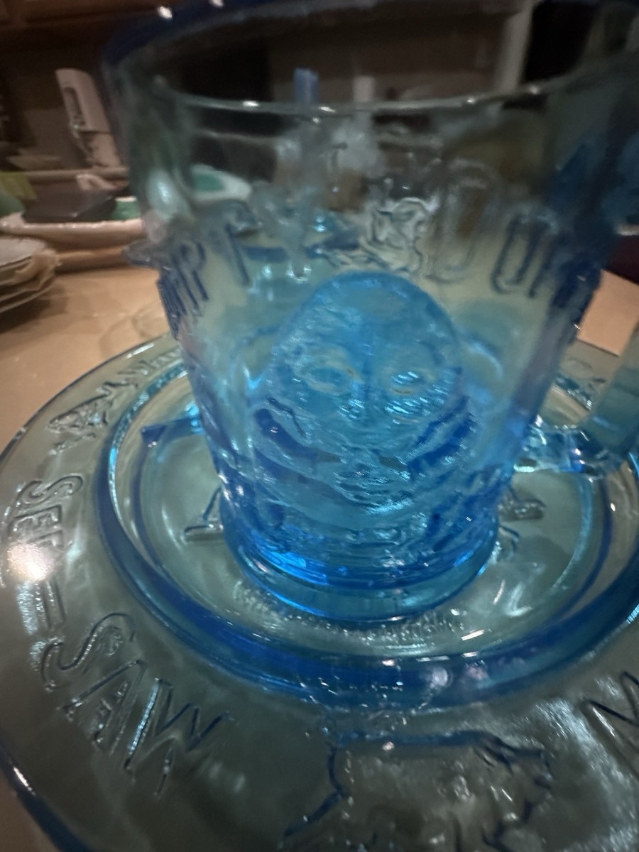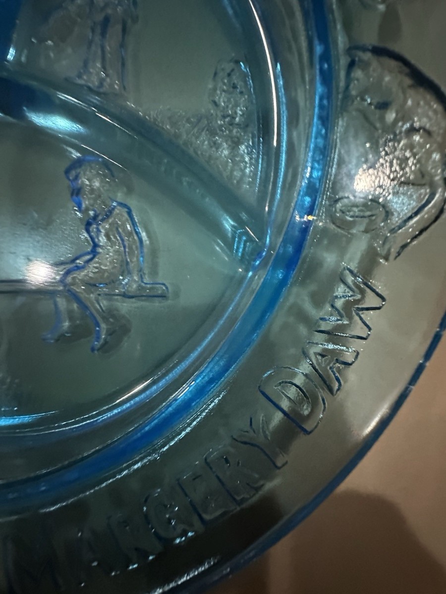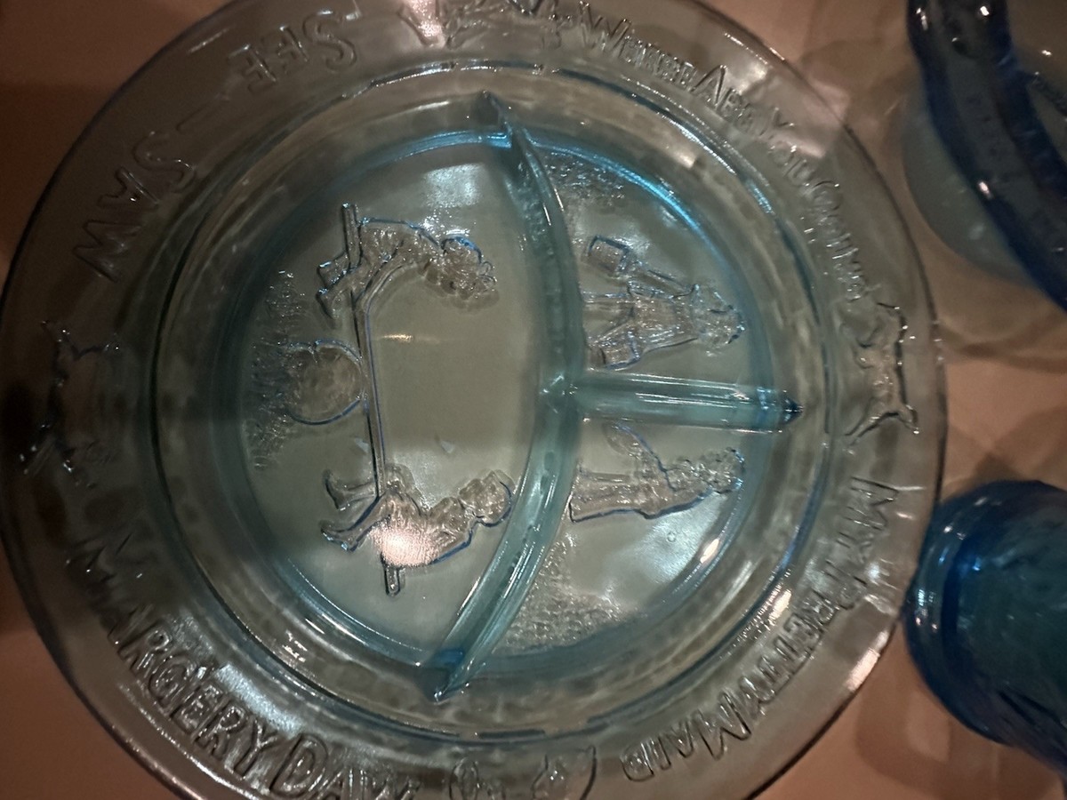 Vintage Tiara Glass Mother Goose 4pc Nursery Rhyme Dish Set Aqua Blue Pre Owned