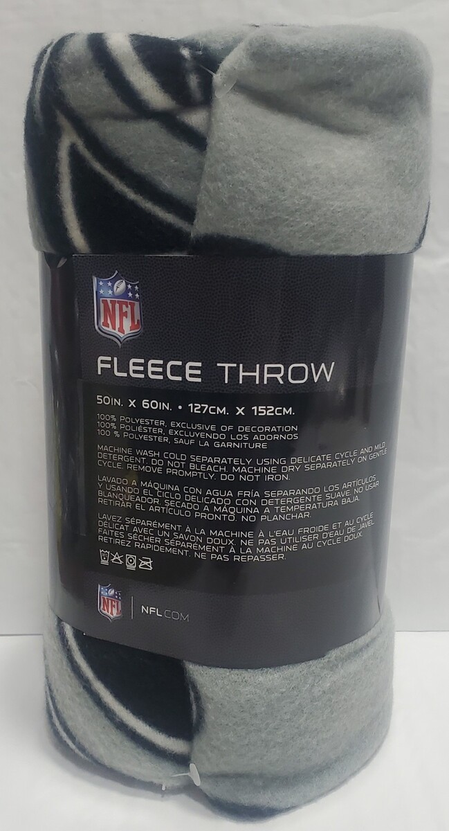 This is a 50" by 60" Las Vegas Raiders Fleece throw blanket.