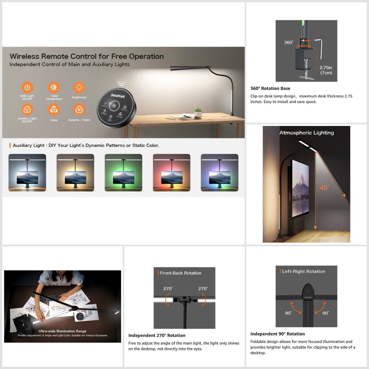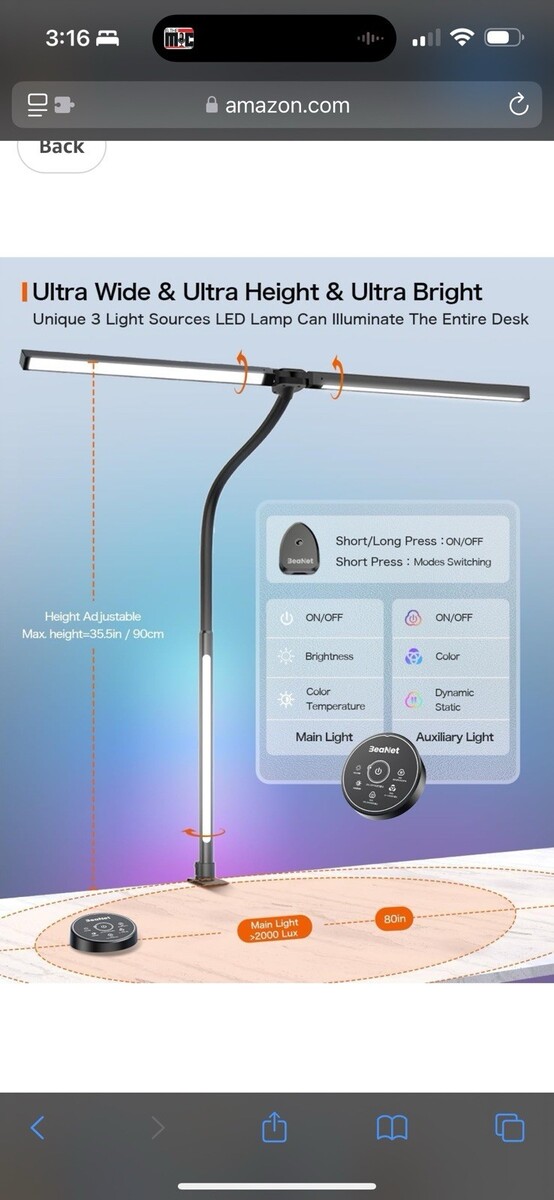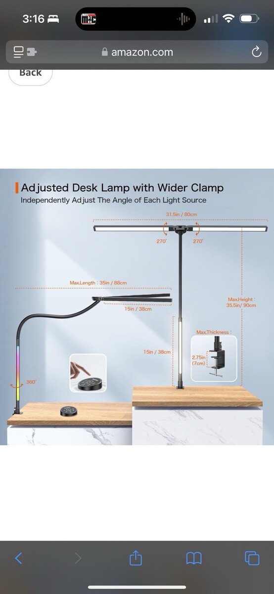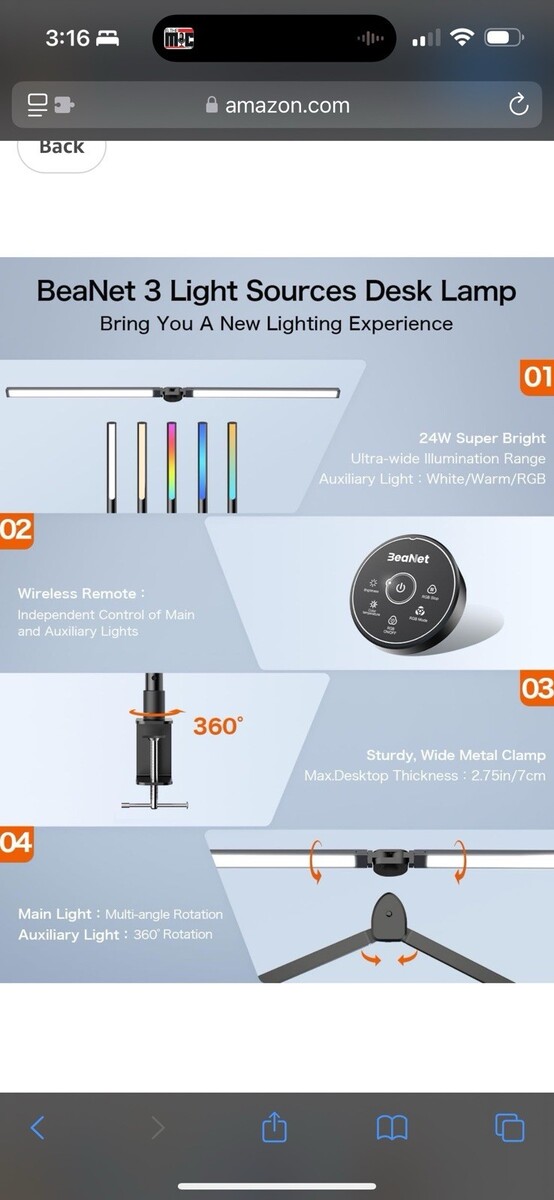 BeaNet desk lamp can be fixed on a tilted desktop, stable and firm. Designed with a 360 geese-neck and 180 foldable swing arms, the lamp head can also rotates 270 front and back independently, allowing you to turn the desk lamp to any angle to provide you with the most suitable light .The clamp on desk lamp with ultra-wide clamp and silicone pads saves your workspace and fits desktop up to 2.75 inches.The memory function will restore your last setting.