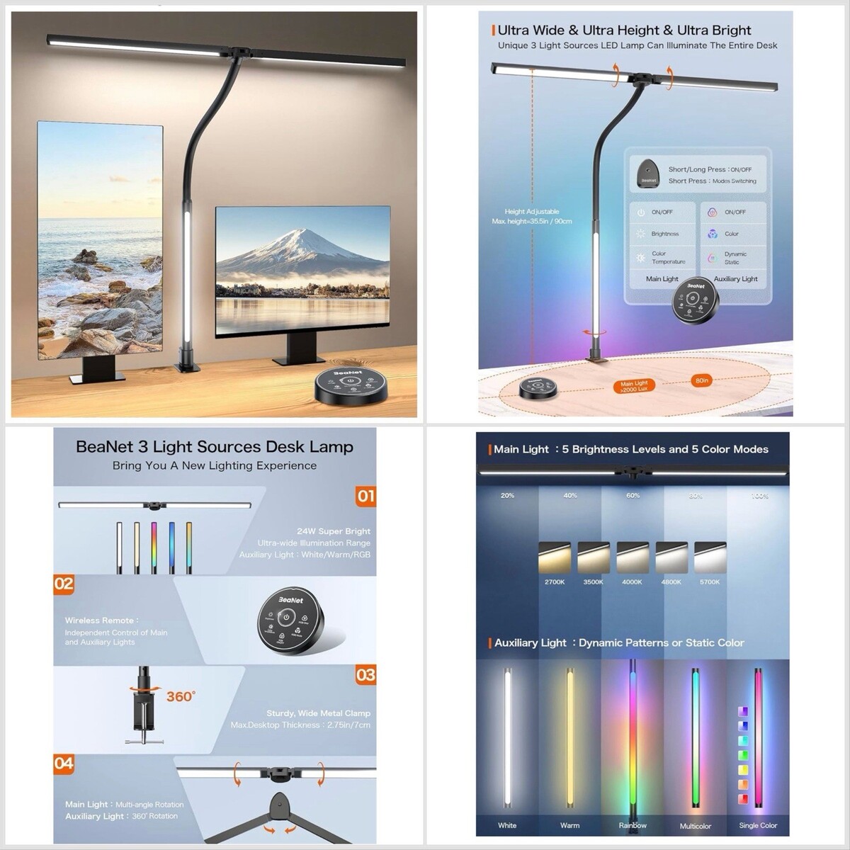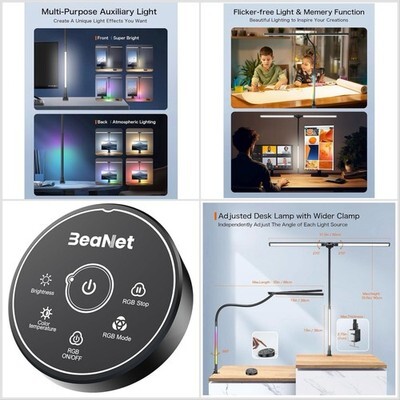 Beanet LED Desk Lamp w/ Clamp for Home Office, 24W Ultra Bright w/ RGB Lighting