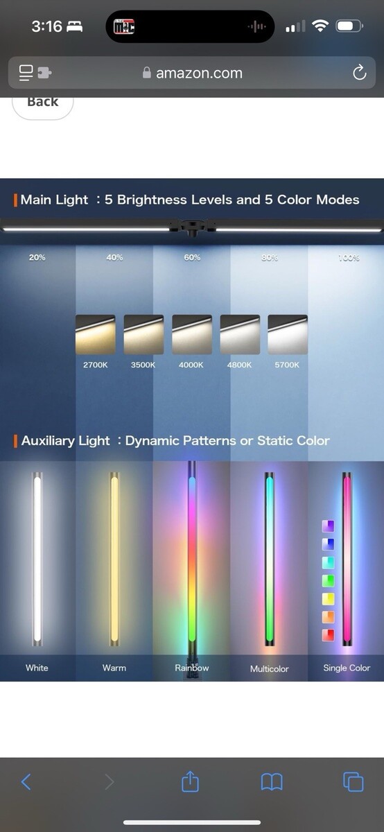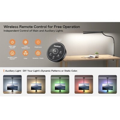 The handy and flexible wireless remote control makes it easy to control the main and auxiliary lights independently.The main light has 5 dimmable levels (20%-40%-60%-80%-100%) and 5 color temperatures (2700K-3500K-4000K-4800K-5700K). The auxiliary light allows you to choose the lighting change mode and your preferred color.The LED lights are flicker-free and glare-free, protecting your eyes.