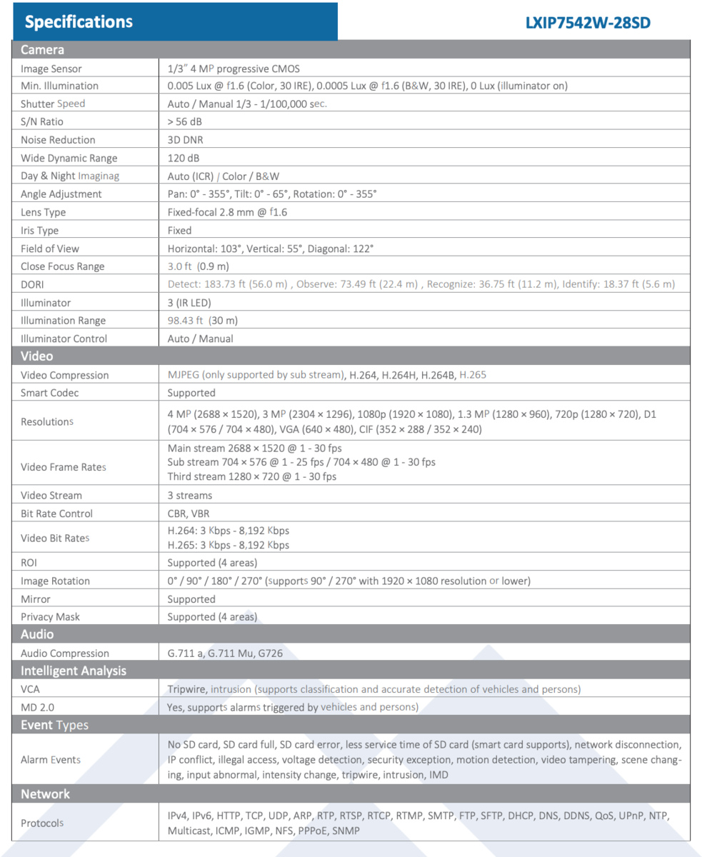 LXIP7542W-28SD PRO-X 4MP IP 2.8mm Low Lux 98ft IR WDR Ai NDAA Vandal Dome Camera