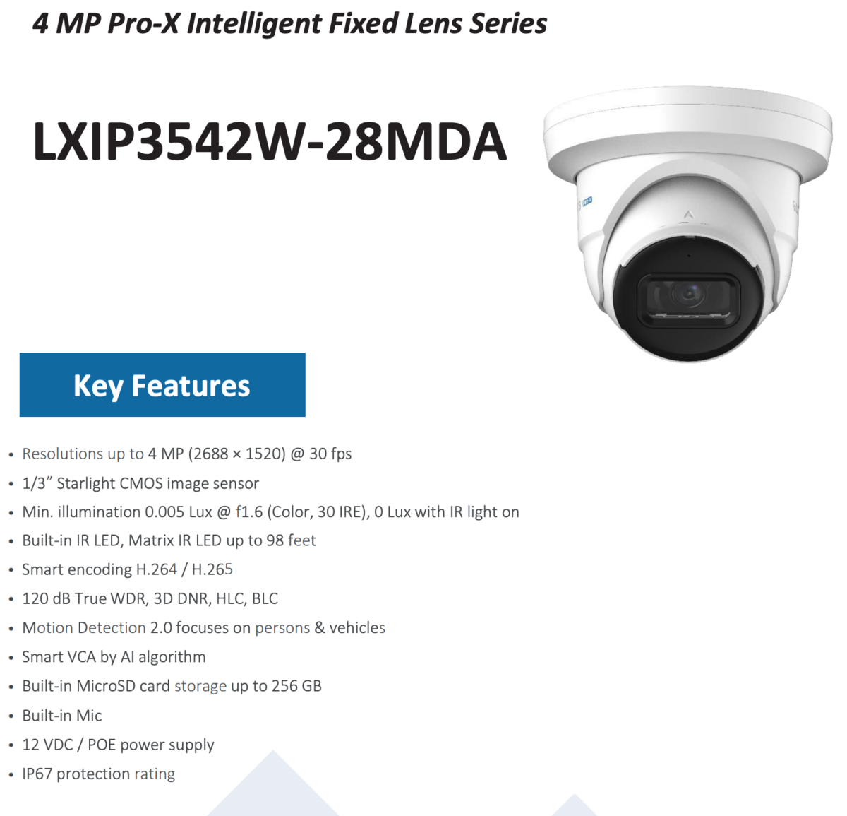 Pro-X, IP, Turret, 4 MP, 2.8 mm, Fixed Lens, 120 dB True WDR, 3D DNR, SD Card, Built-in Mic, POE Power Support, IP67, MD 2.0 - Human and Vehicle Detection