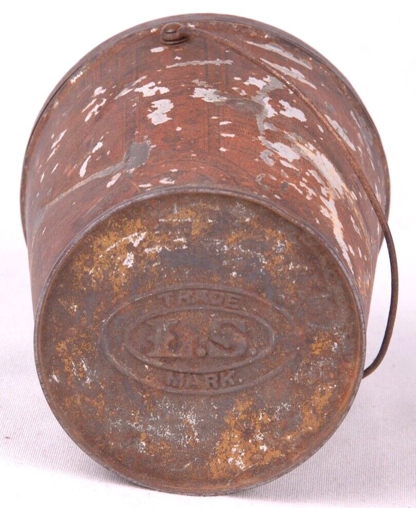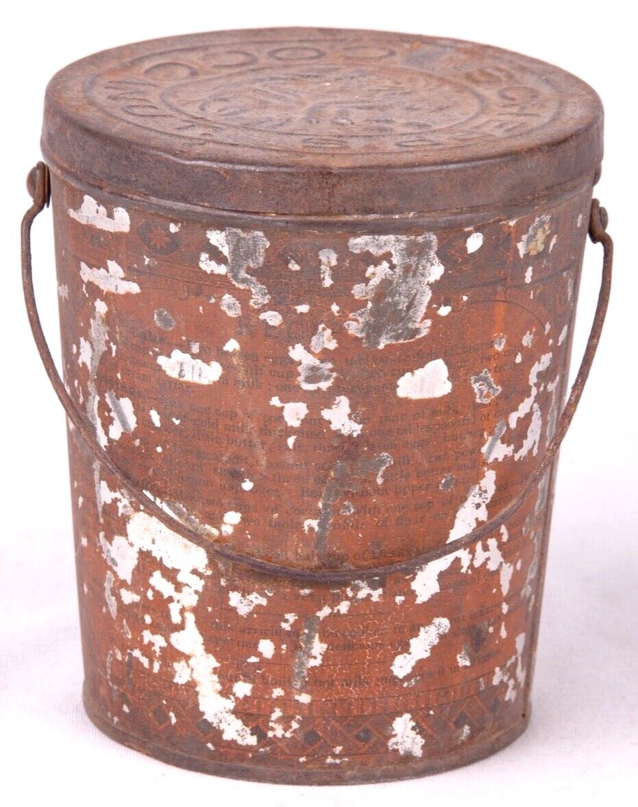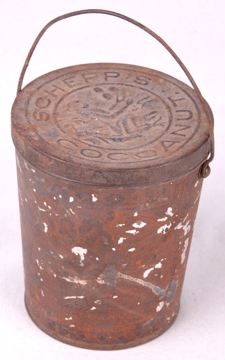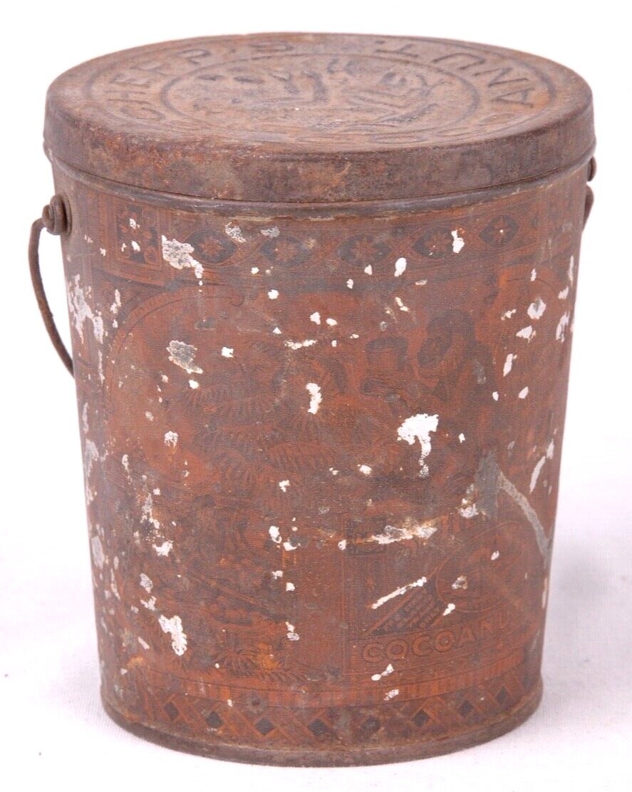 ANTIQUE SCHEPP'S COCOANUT LITHOGRAPHED MONKEY TIN w/ BAIL HANDLE & EMBOSSED LID