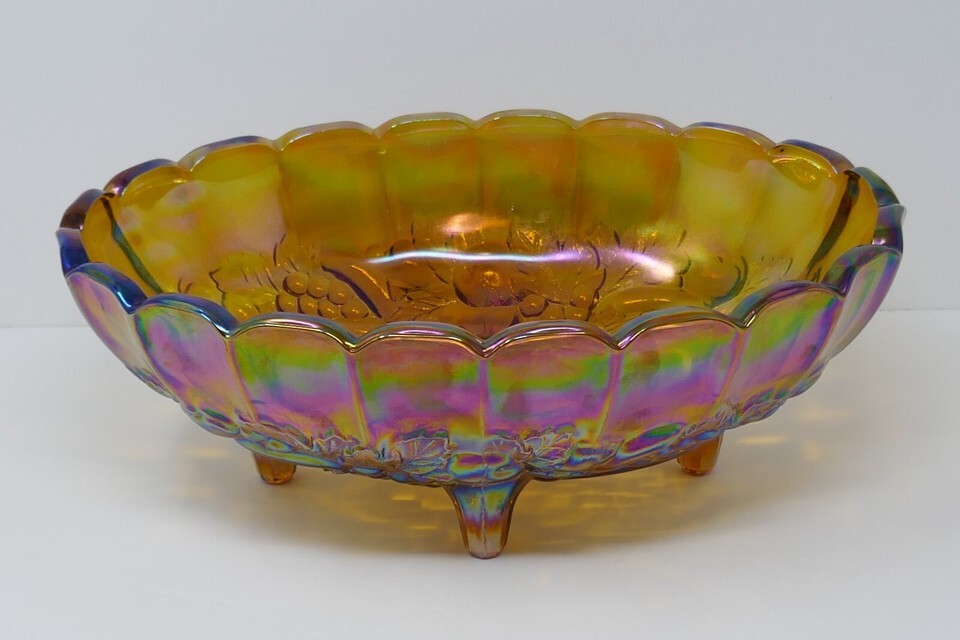 Indiana Iridescent Carnival Glass Oval Harvest Grape Amber Footed Fruit Bowl