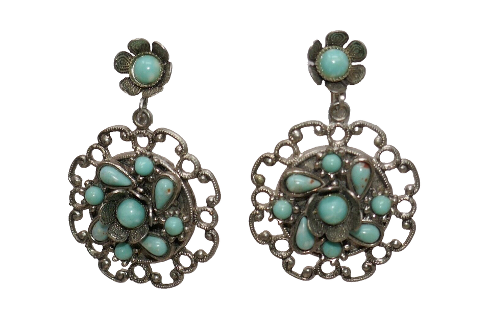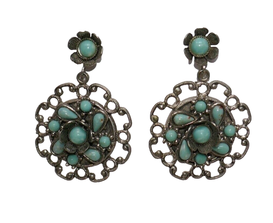 Silver Tone Faux Turquoise Filigree Screw Back Earrings & Pendant
