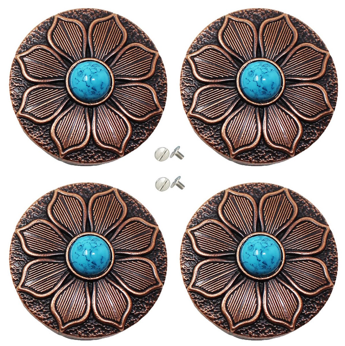 Set of 4 screw back conchos. Accented with copper engraving flower and turquoise stone. Measures 1 1/4" (32 mm) in diameter. Easy to install with chicago screws included. Beautifully accents any tack, saddle, belt, etc.?
