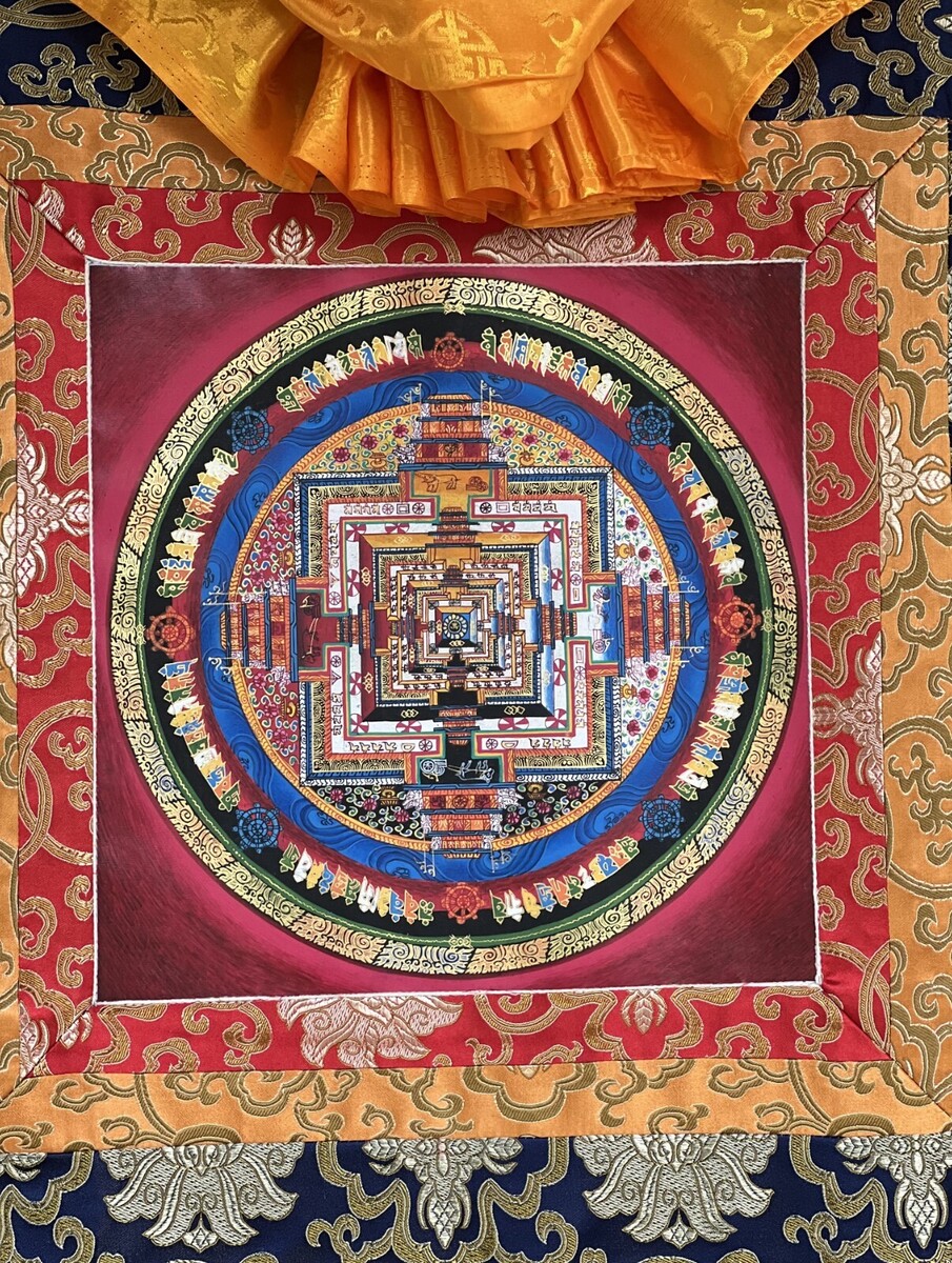 HAND-PAINTED KALACHAKRA MANDALA TIBETAN THANGKA PAINTING WITH SILK BROCADE