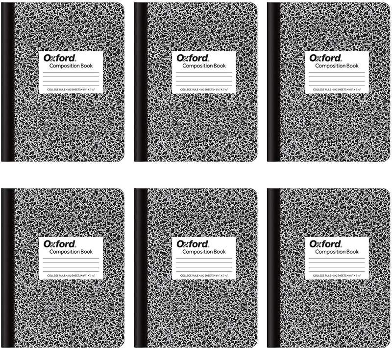 Oxford composition notebook multipacks now come in convenient 6 packs perfect for school supplies, office supplies and everyday use. These college-ruled notebooks provide skinny lines to fit more creative writing, journaling, note taking or lab work per page than wide-ruled paper. Center-sewn notebook pages make the composition notebook a teacher favorite. Creates a tamper-evident, permanently bound journal, science notebook, bullet journal or writing notebook. Also makes a great homeschool preschool tool for beginning writers. Paper handles ink pens, colored pencils and highlighters for fun writing practice and beautiful notes. Classic marble covers have a space for name and class, and weight and measurement conversion charts inside. Composition notebooks are an affordable addition to the home office, traditional, or homeschool supplies lists; ideal for journalers, writers, artists, scientists and note takers of all stripes. College ruled paper. 9-3/4" x 7-1/2". 100 Sheets. 6 Pack.