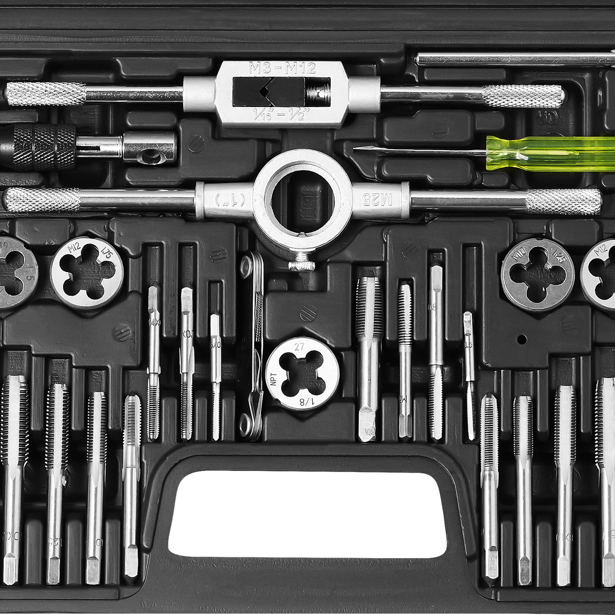 All-in-One Tap Die Set: This tap die set includes 34 pcs dies, 34 pcs taps, 2 x die handle, 2 x tap wrench, 2 x T-type tap wrench, 2 x screw pitch gauge, and 2 x screwdriver. Sizes: M3x0.5, M3x0.6, M4x0.7, M4x0.75, M5x0.8, M5x0.9, M6x1.0, M6x0.75, M7x1.0, M7x0.75, M8x1.25, M8x1.0, M10x1.25, M10x1.5, M12x1.75, M12x1.5, 1/8-27NPT, 4-40NC, 6-32NC, 8-32NC, 10-24NC, 12-24NC, 1/4-20NC, 5/16-18NC, 3/8-16NC,7/16-14NC, 1/2-13NC, 10-32NF, 5/16-24NF, 1/4-28NF, 3/8-24NF, 7/16-20, 1/2-20, 1/8-27NPT.