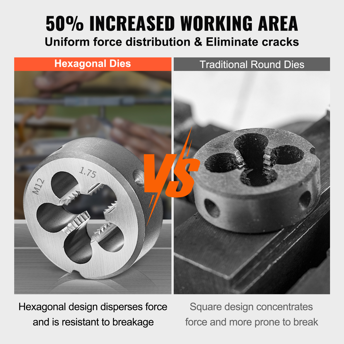 Professional Design: The tap and die kit features a hexagonal die design that distributes force more evenly during work. With stringent manufacturing processes, the product is robust, durable, and resistant to breakage. The tapered teeth of the tapping tools are specially designed for easy and smooth threading initiation while preventing over-threading.