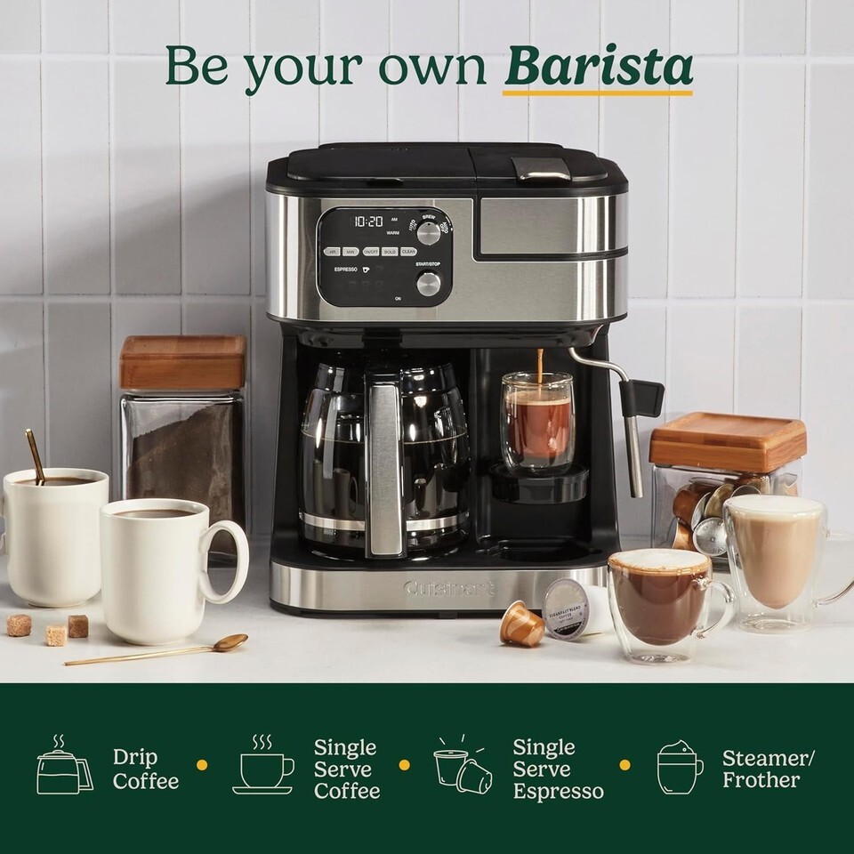 Bring the cafe home with the Cuisinart Coffee Center Barista Bar 4-in-1 Coffee Maker and experience four brew options with compact convenience. Serve friends and family with 12 cups of fresh coffee brewed to perfection with programmable time and strength settings. (cup equals approx. 5 oz. (varies by brewing technique) and single-serve cappuccinos, lattes, and espresso.). Or go solo with single-serve cups, in 6-, 8-, and 10 oz. sizes, made in minutes and compatible with most single-serve pods. The coffee machine lets you add variety to drinks with the steam wand that makes frothed and steamed milk for cappuccinos, lattes, or the specialty drink of your choice. The wand is also perfect for pouring hot water for tea, matcha, hot cereals, and soups. With sleek modern styling and total versatility, this space-saving all-in-one Cuisinart Coffee Center Barista Bar 4-in-1 Coffee Maker is sure to be the favorite spot in any kitchen.