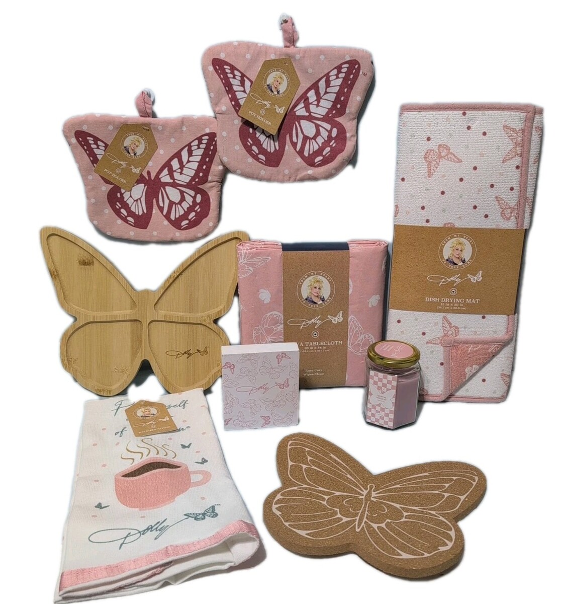 9 Pc Lot Dolly Parton DG Exclusive Butterfly Pink Kitchen Collection NEW