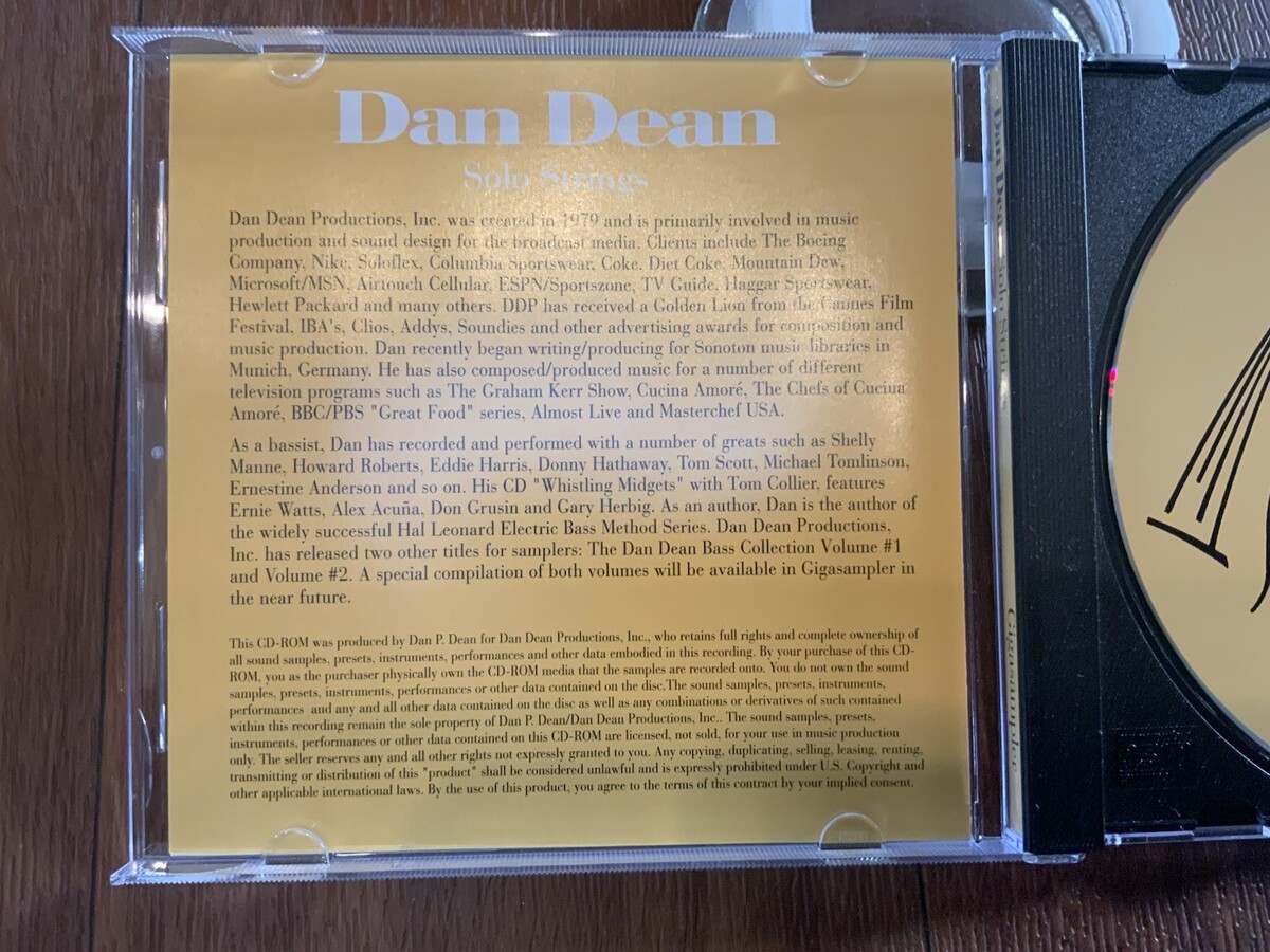 The Dan Dean Productions, Inc 2000 Dan Dean Solo Strings Gigasampler CD is a music-related product that features solo strings of violin, viola, and cello.