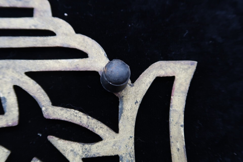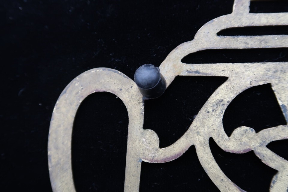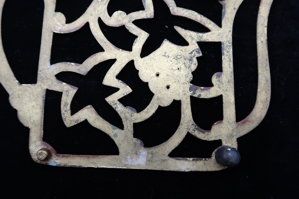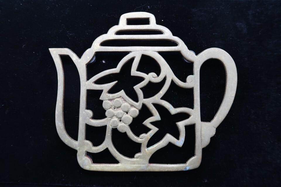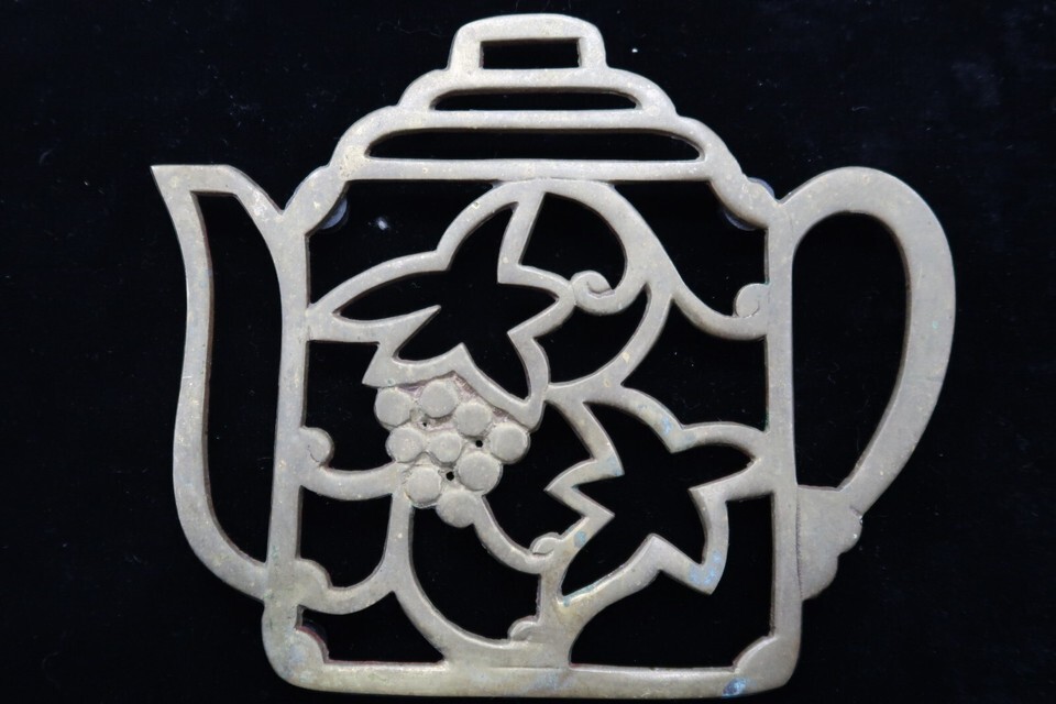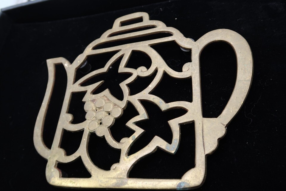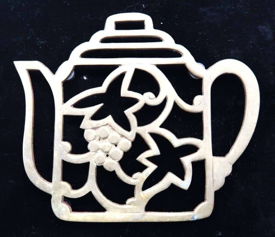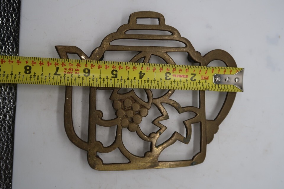 Vintage Brass Open Work Teapot Grapes Shaped Trivet Decor MCM 7" Footed Kitschy