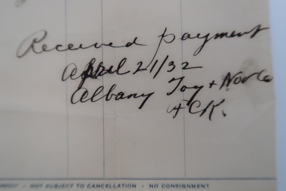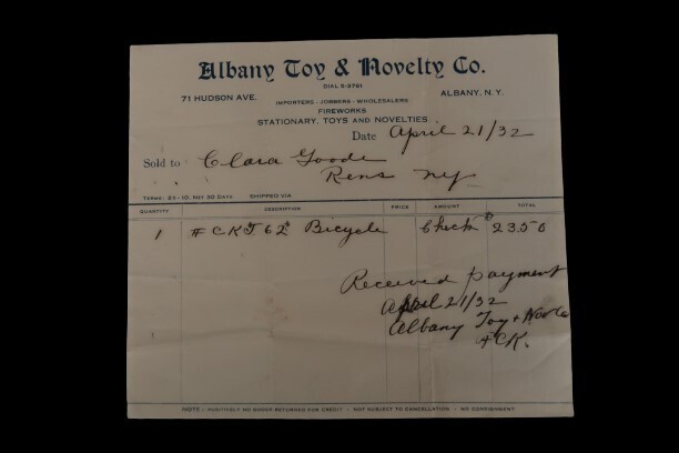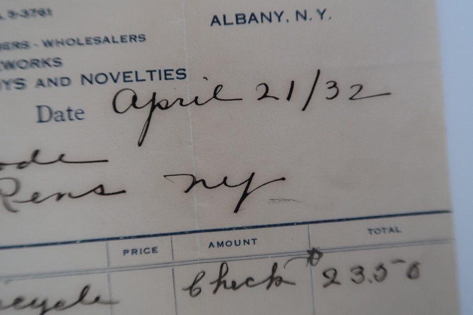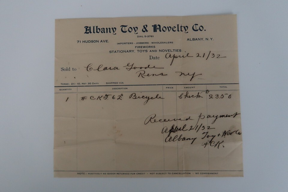 Vtg Albany Toy & Novelty Co Receipt for Bicycle 1932 Unusual NY Ephemera