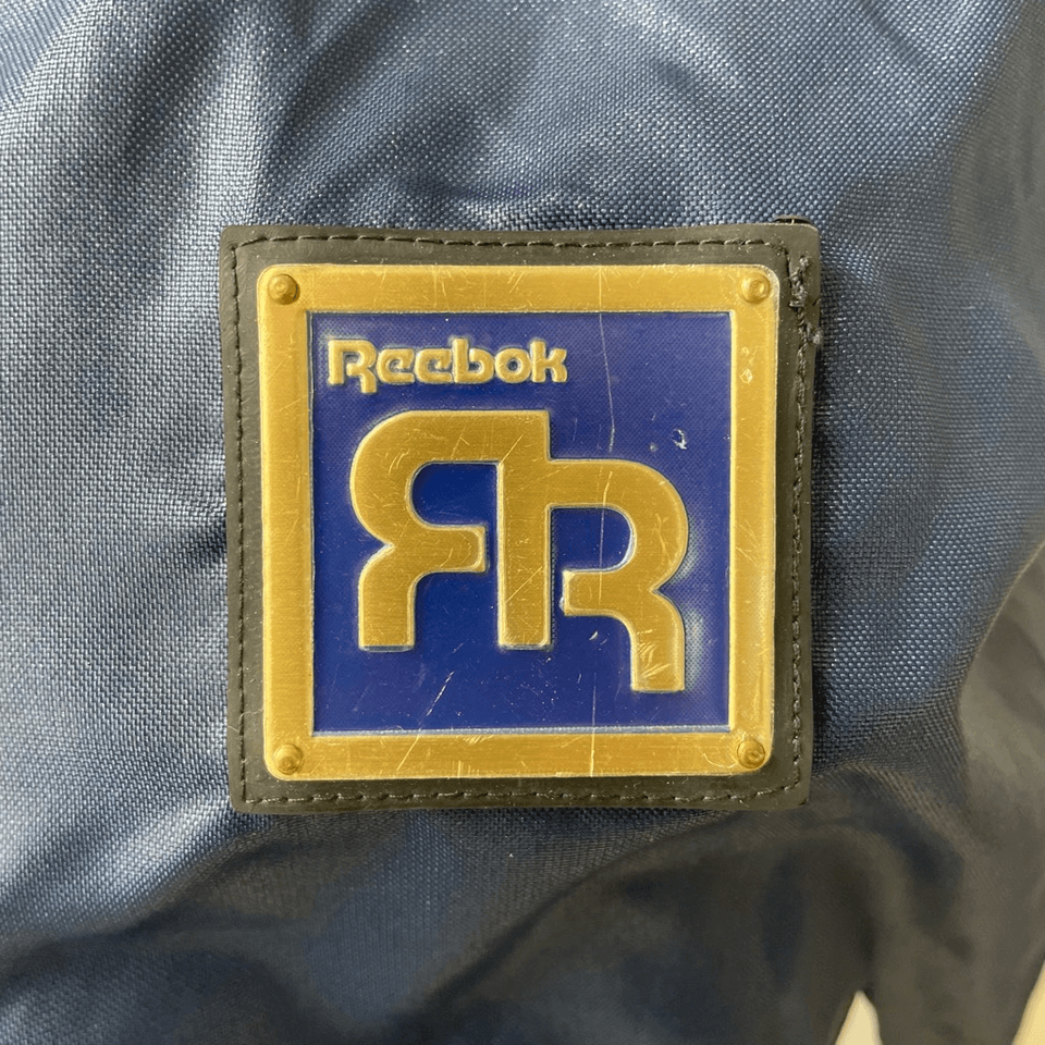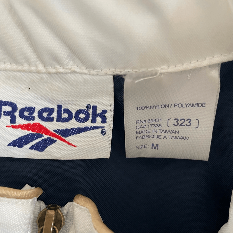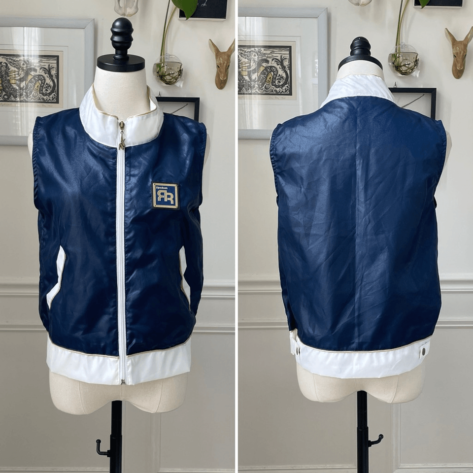 This is quite a find! Vintage 90s Reebok streetwear full zip vest. The vest is navy blue with white trim and muted champagne gold piping. It is 100% nylon with a polyamide coding that gives it a little bit of a sheen. Gold and blue metal logo plate at the chest and Logo zipper pull. Tab snaps at the waist that are adjustable. Welt pockets. This is from the heyday of streetwear and is a very difficult to find item. I do not know if this was originally men?s or women?s because there is no indication. It measures 21 inches shoulder to hem and 19 inches armpit to armpit. To me, it looks like a true unisex piece so please double check measurements to ensure the proper fit for you