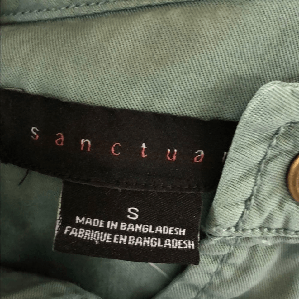 New without tags sanctuary green large snap safari shirt or lightweight jacket. Band color and flap pockets at the hip. Roll tab sleeves. Tag has been marked through to prevent store returns.