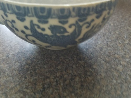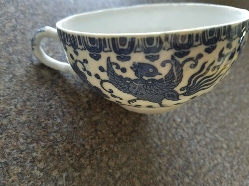 VINTAGE CHINA CUP, BLUE AND WHITE DESIGN