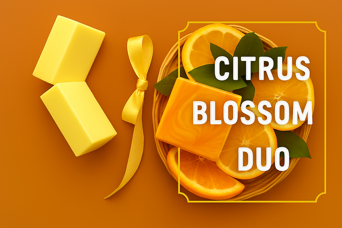 Bright, refreshing, and handcrafted with care — this duo pairs two creamy yellow soap bars with a swirled Orange Blossom square, nestled among fresh orange and lemon slices. A satin ribbon adds a soft, elegant touch, while the vibrant citrus and glossy green leaves evoke a sunlit grove in full bloom. Perfect for spring gifting, seasonal bundles, or shelf styling, this set radiates warmth and clarity.